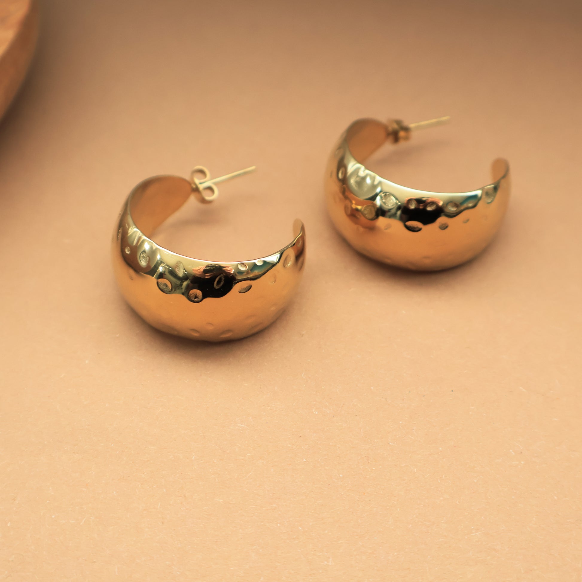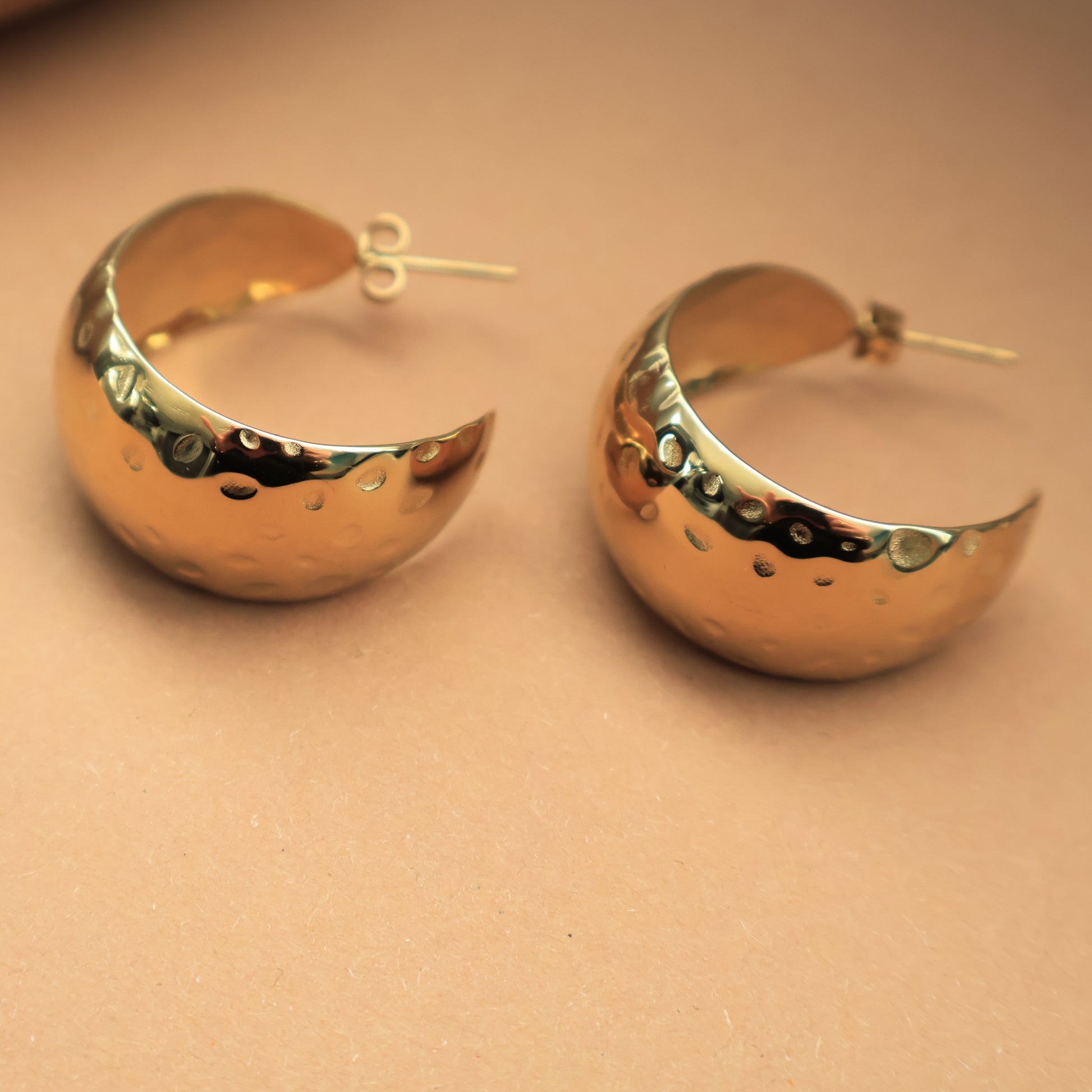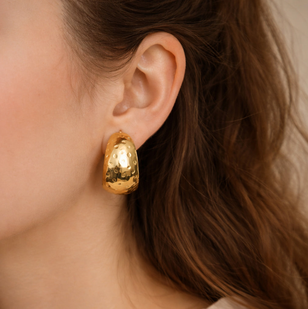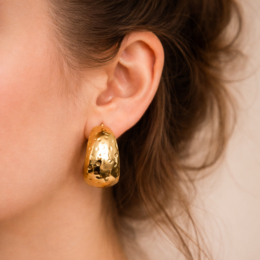 Diese Creolen in Gold aus Edelstahl sind ein echtes Allround-Schmuckstück. Die strukturierte Oberfläche reflektiert das Licht sanft und sorgt für eine lebendige Optik, ohne aufdringlich zu wirken.