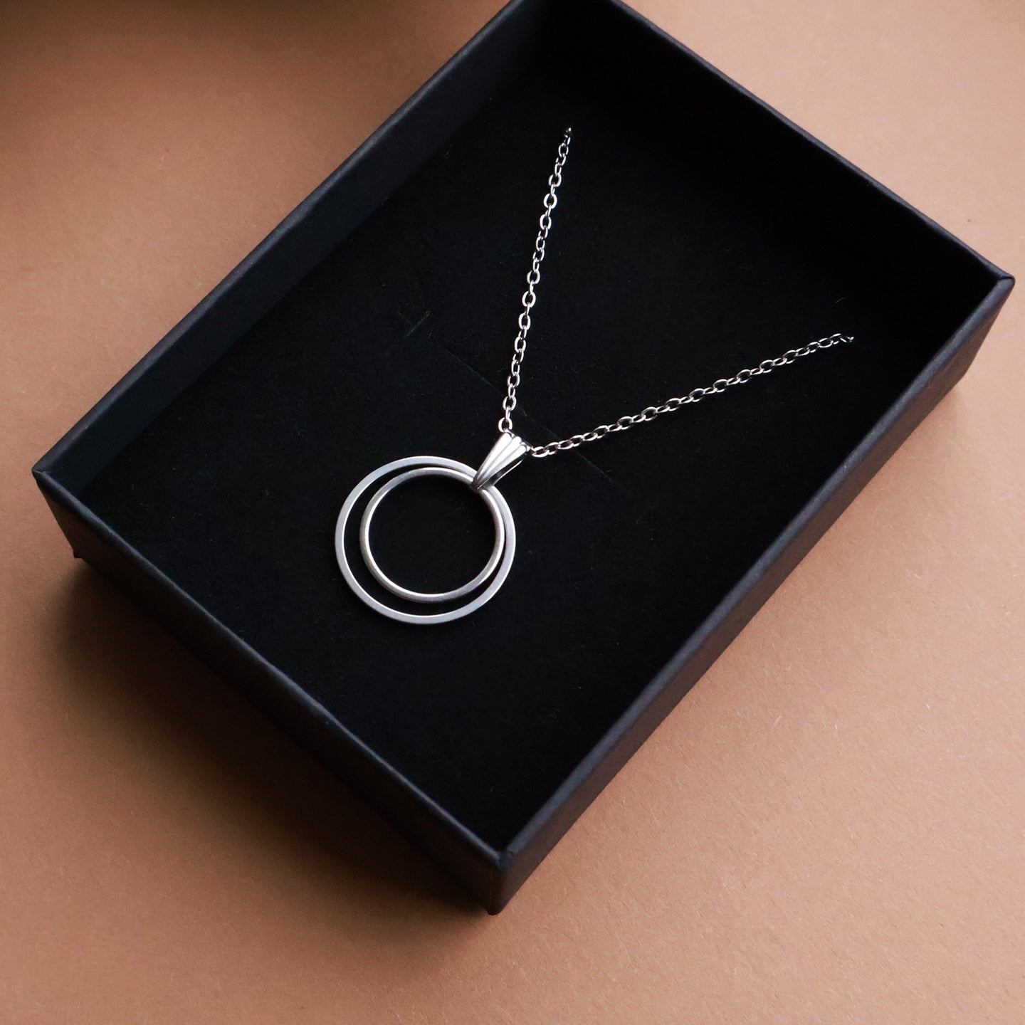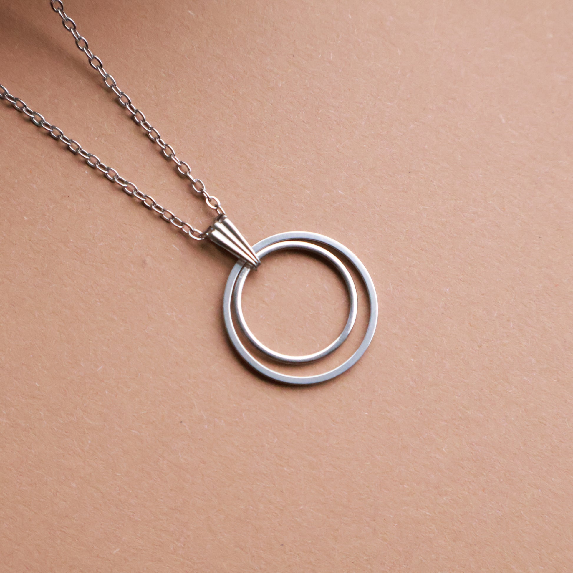 Der zeitlose Anhänger besteht aus zwei Kreisen mit einem Durchmesser von 20 mm und 16 mm.
