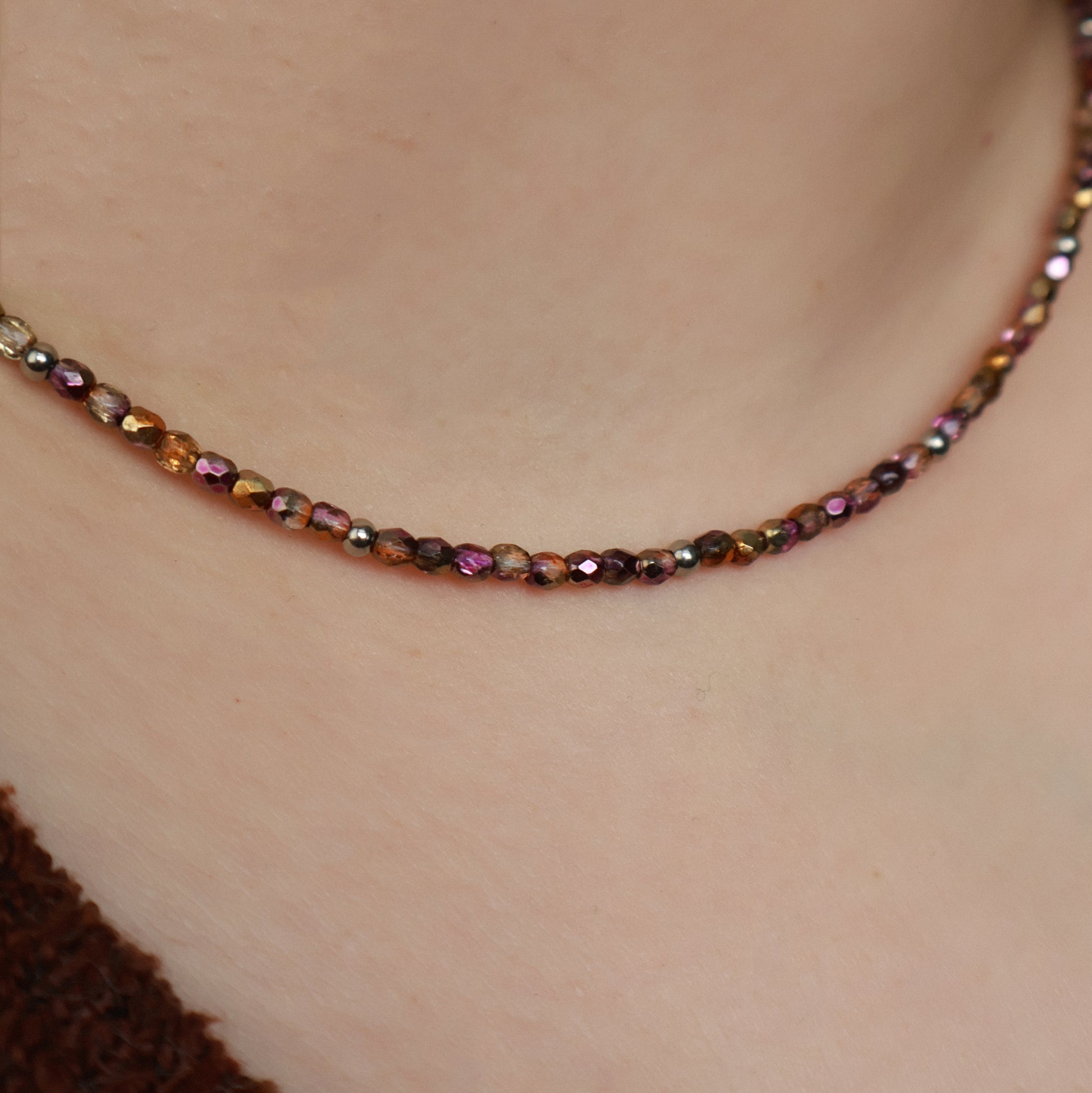 Halskette Ember in funkelnden Erdtönen, Handgefertigte Perlenkette aus Edelstahl in Silber
