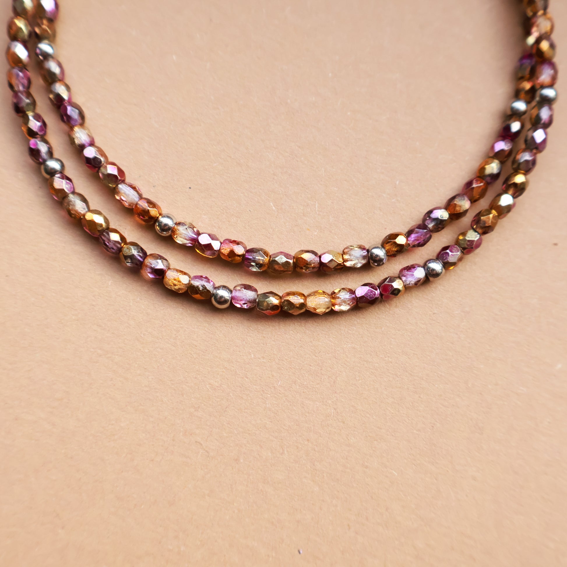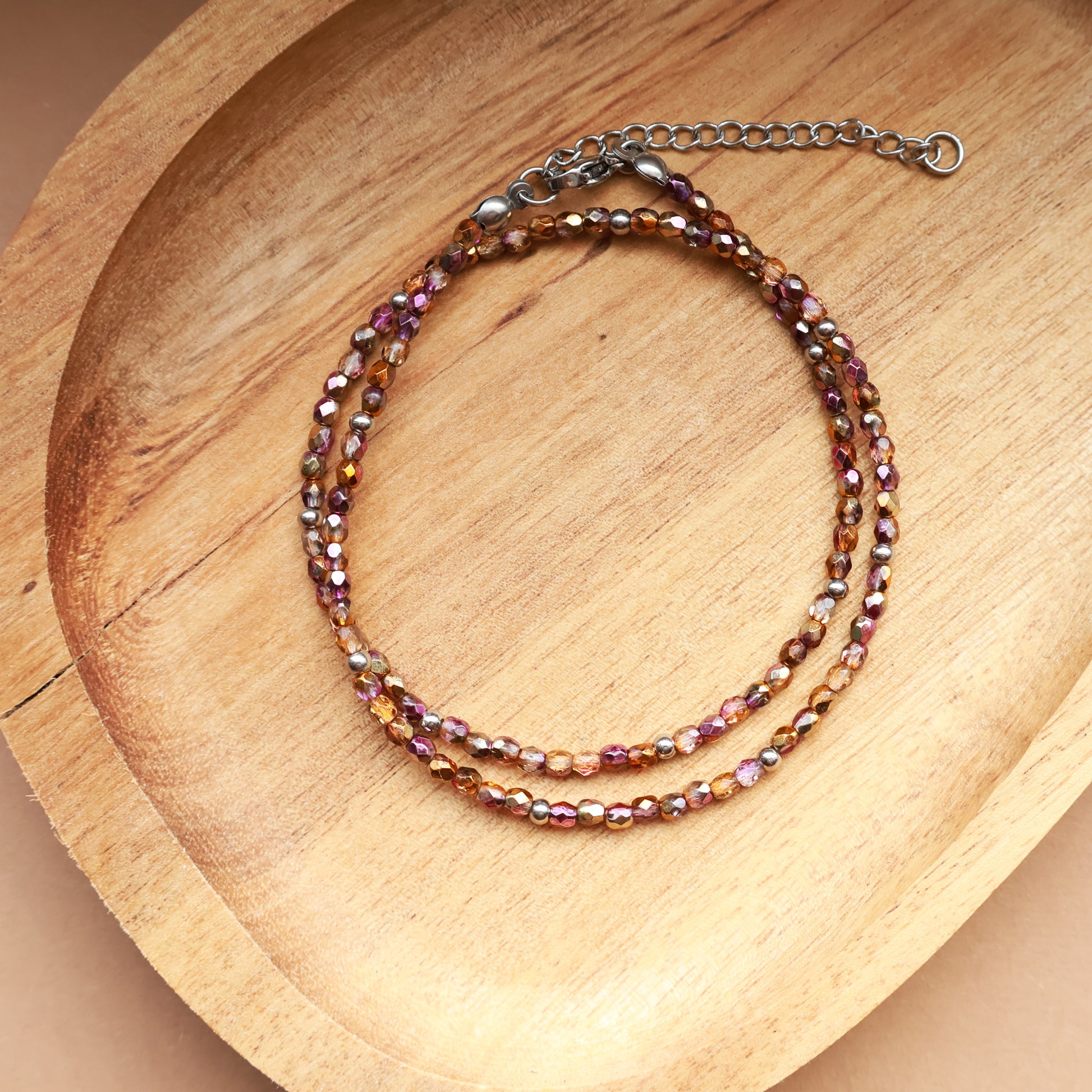 Ember ist eine zarte Perlenkette aus 3 mm Glasperlen mit feinem Schimmer, ergänzt durch Edelstahl-Zwischenperlen in Silber.
