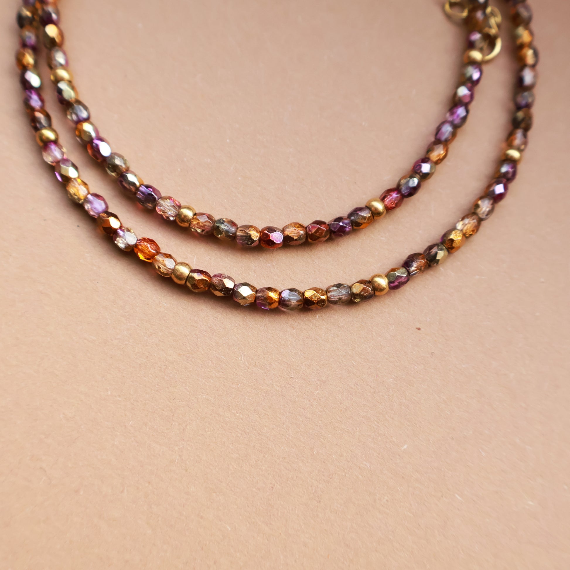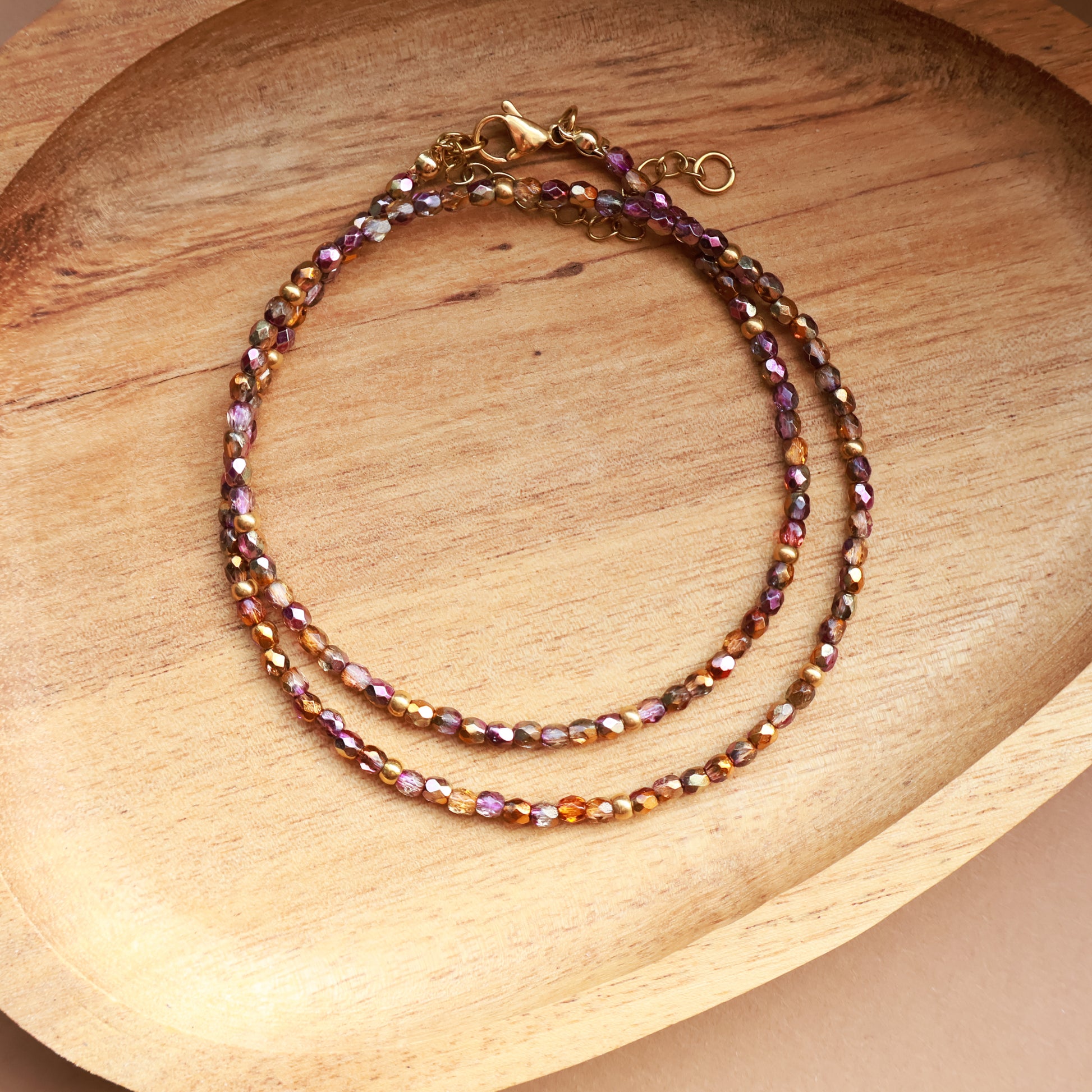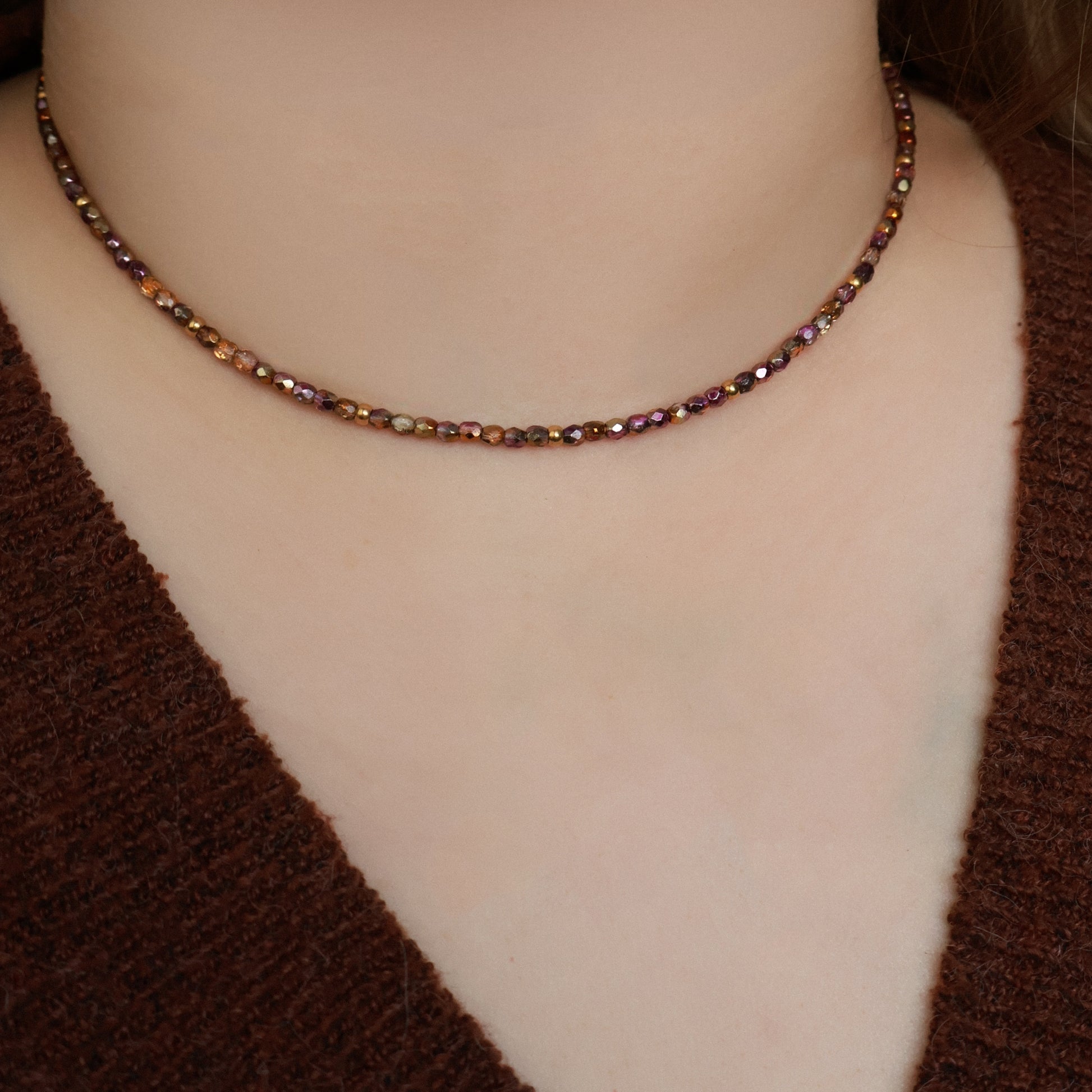 Ember ist eine zarte Perlenkette aus 3 mm Glasperlen mit feinem Schimmer, ergänzt durch vergoldete Edelstahl-Zwischenperlen.