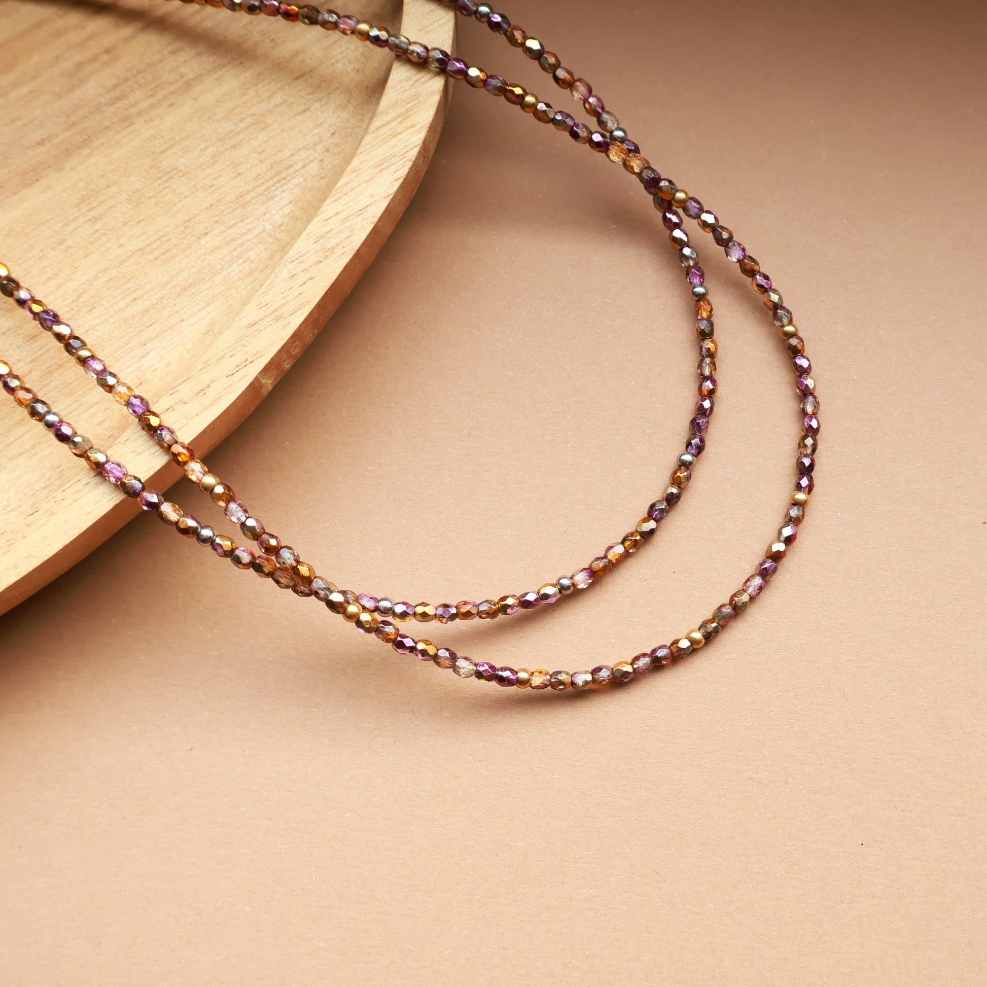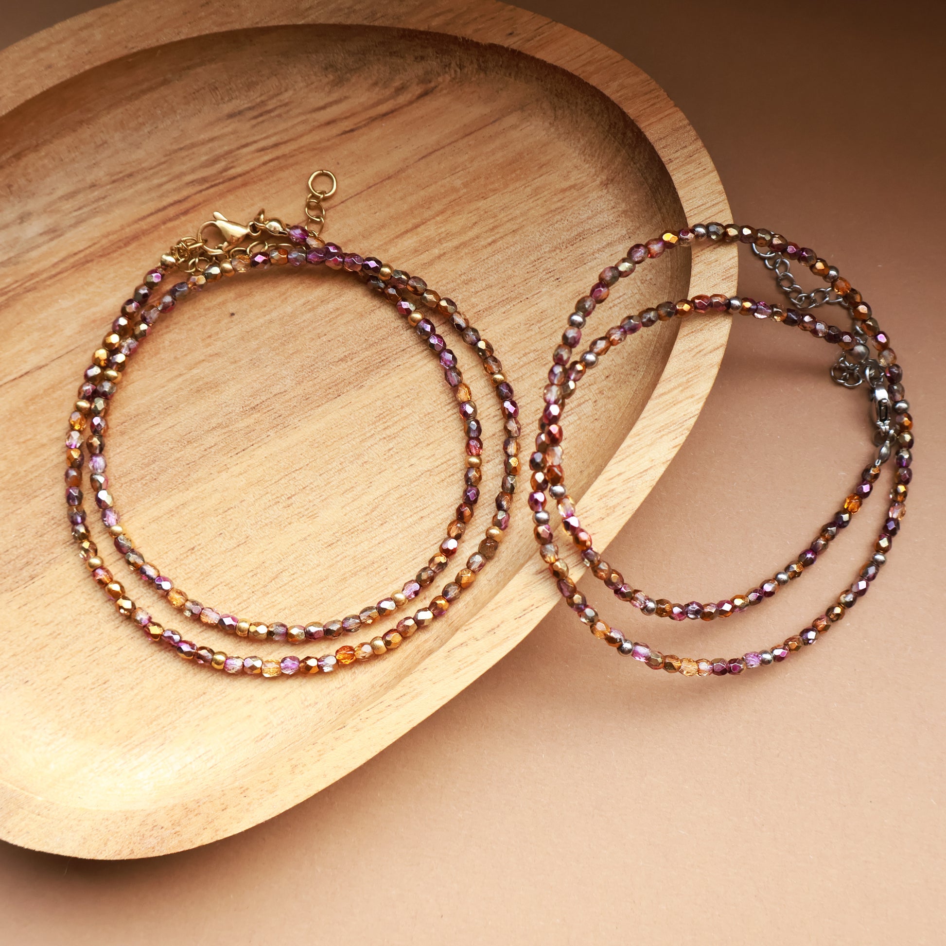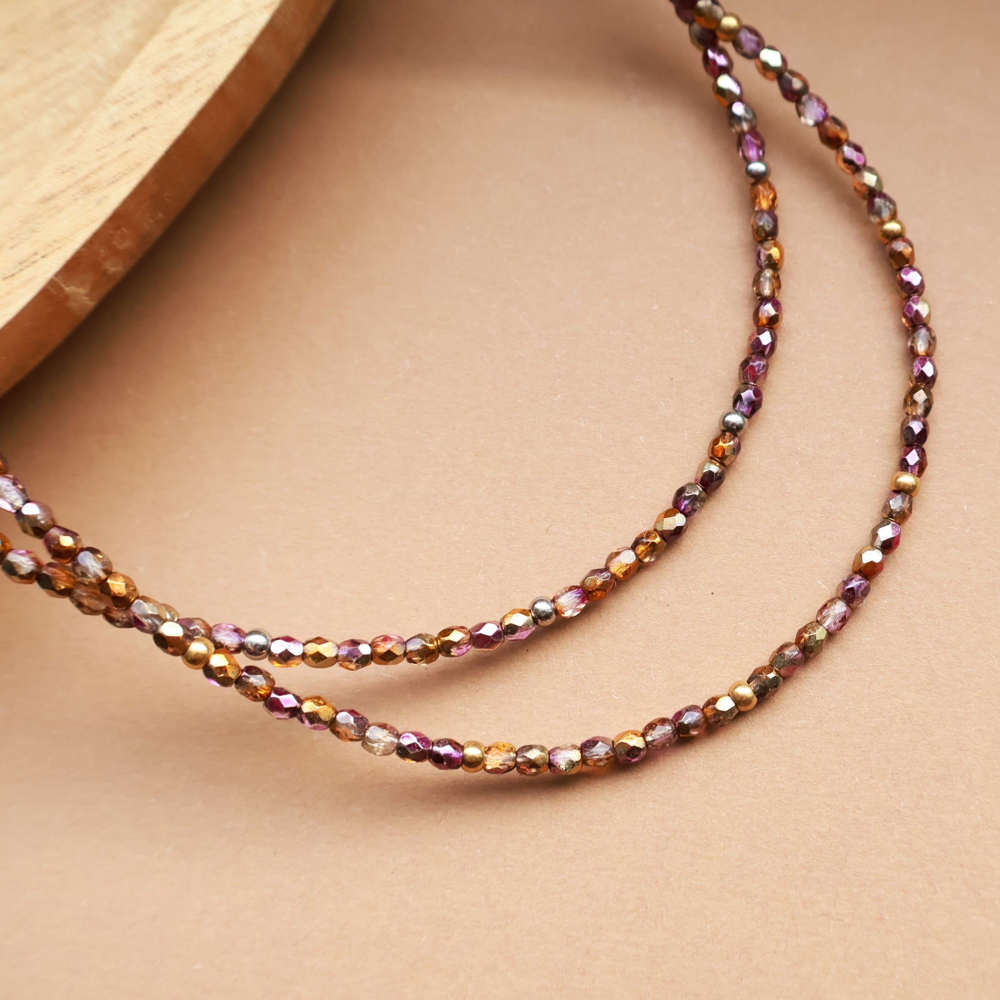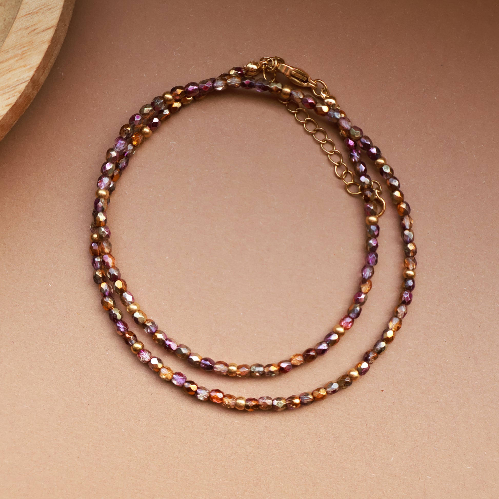 Ember ist eine zarte Perlenkette aus 3 mm Glasperlen mit feinem Schimmer, ergänzt durch vergoldete Edelstahl-Zwischenperlen.