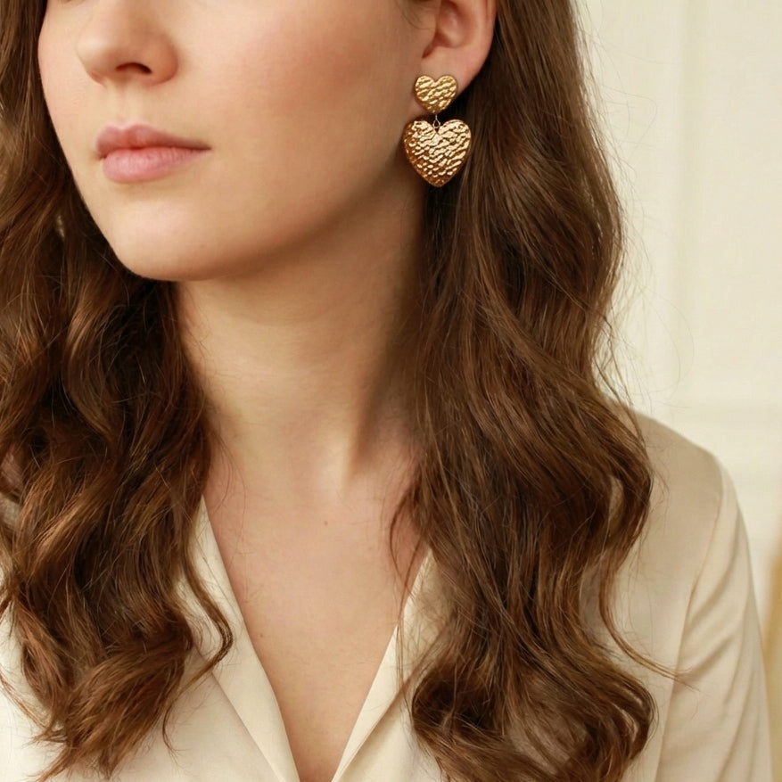 Romantisch und zeitlos, diese goldenen und strukturierten Herz-Ohrringe aus Edelstahl sind ein echtes Must-have. Sie sind so vielseitig, dass sie zu eleganten, lässigen oder romantischen Looks passen. Ob du sie zu einem schicken Abendkleid oder zu Jeans und Bluse kombinierst, sie verleihen jedem Outfit das gewisse Etwas.