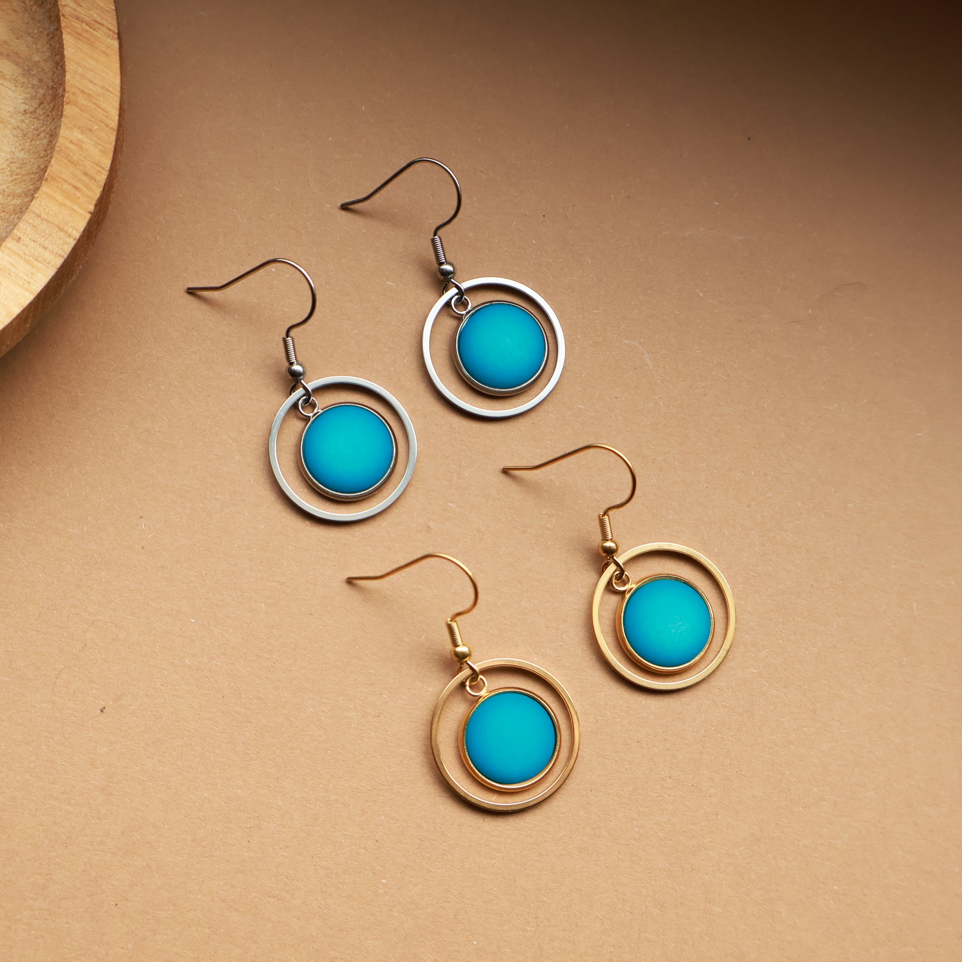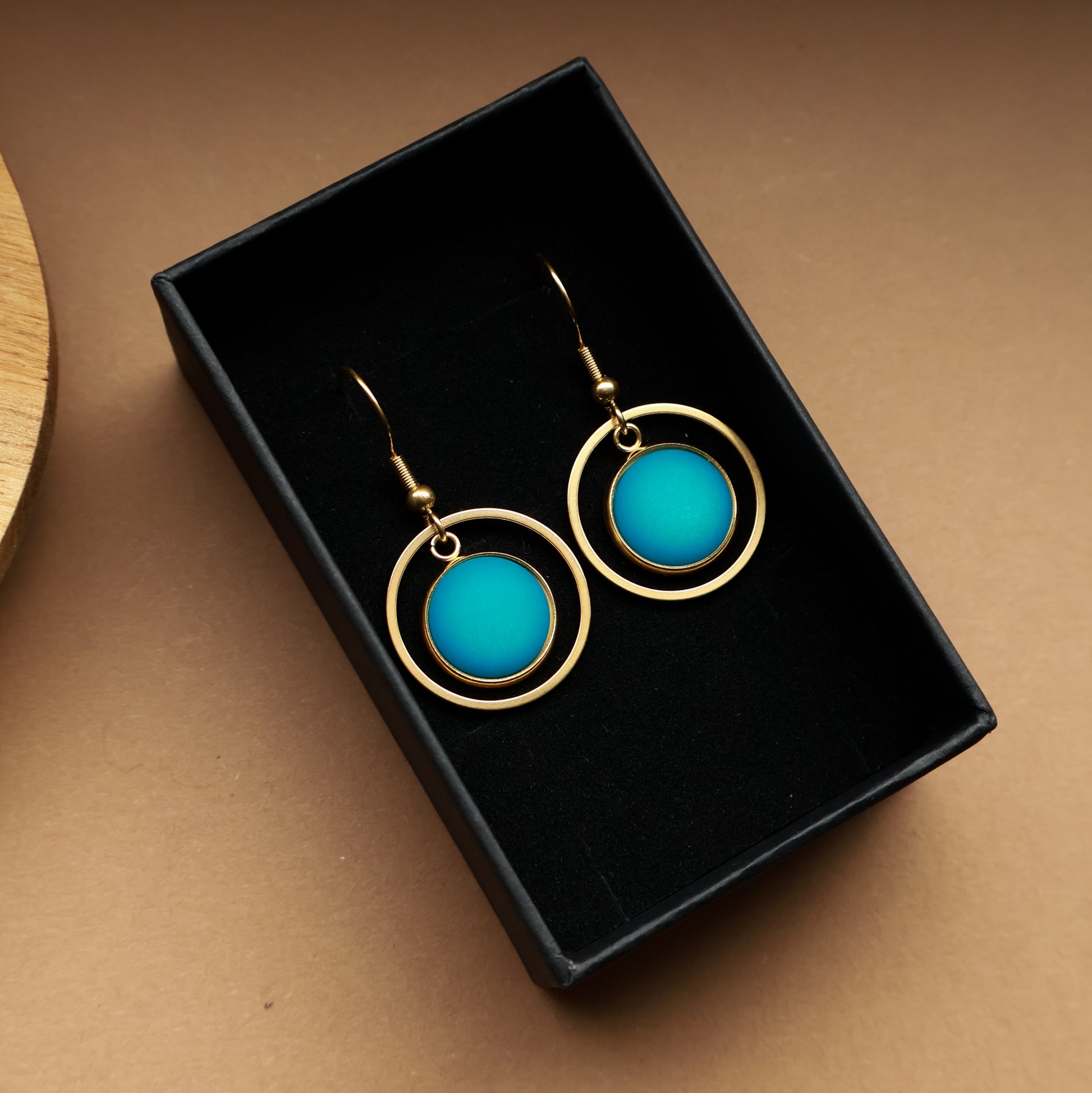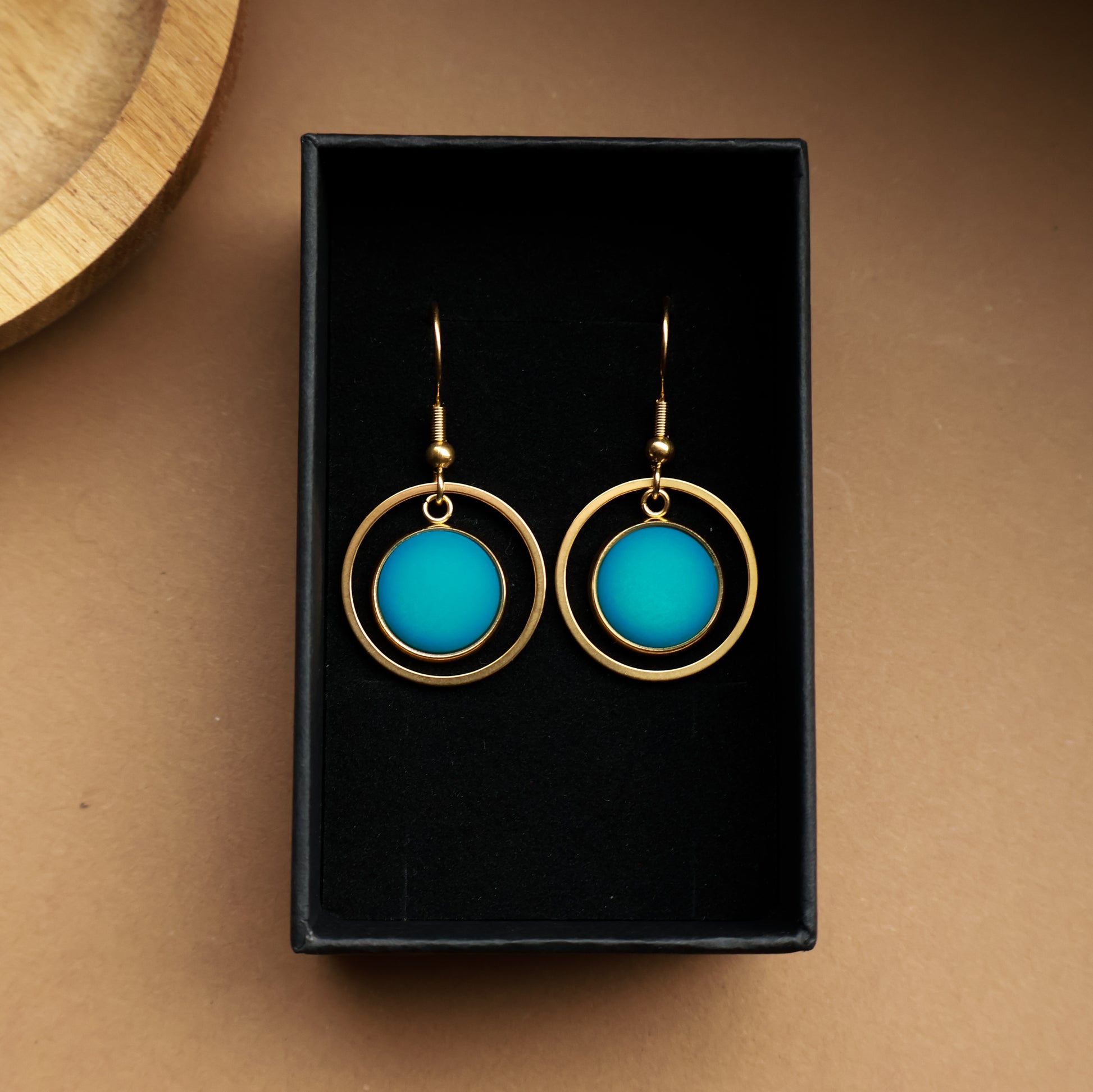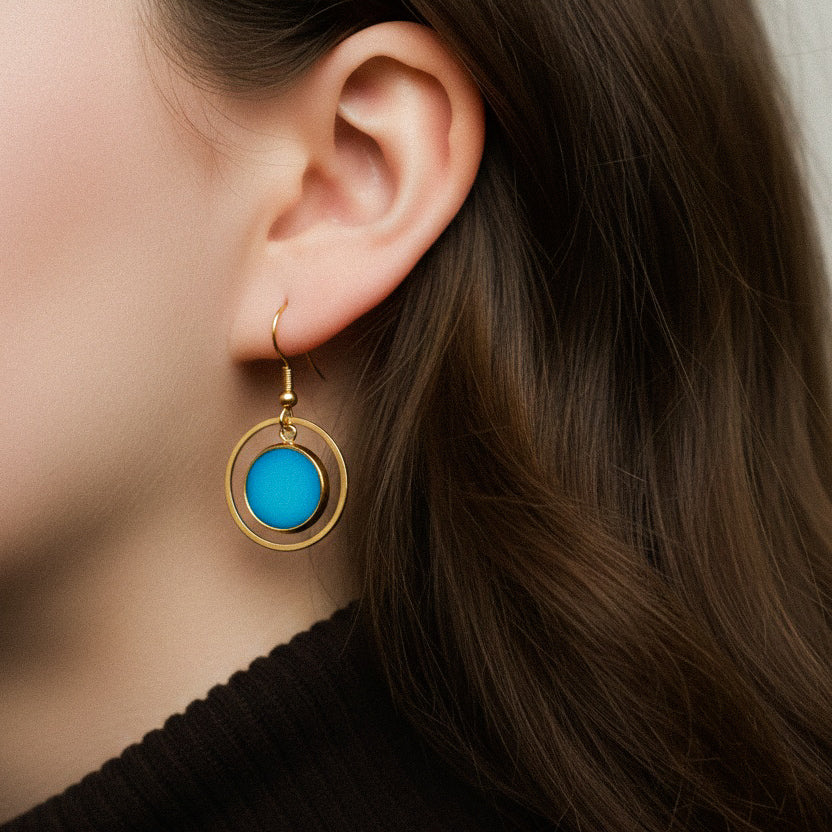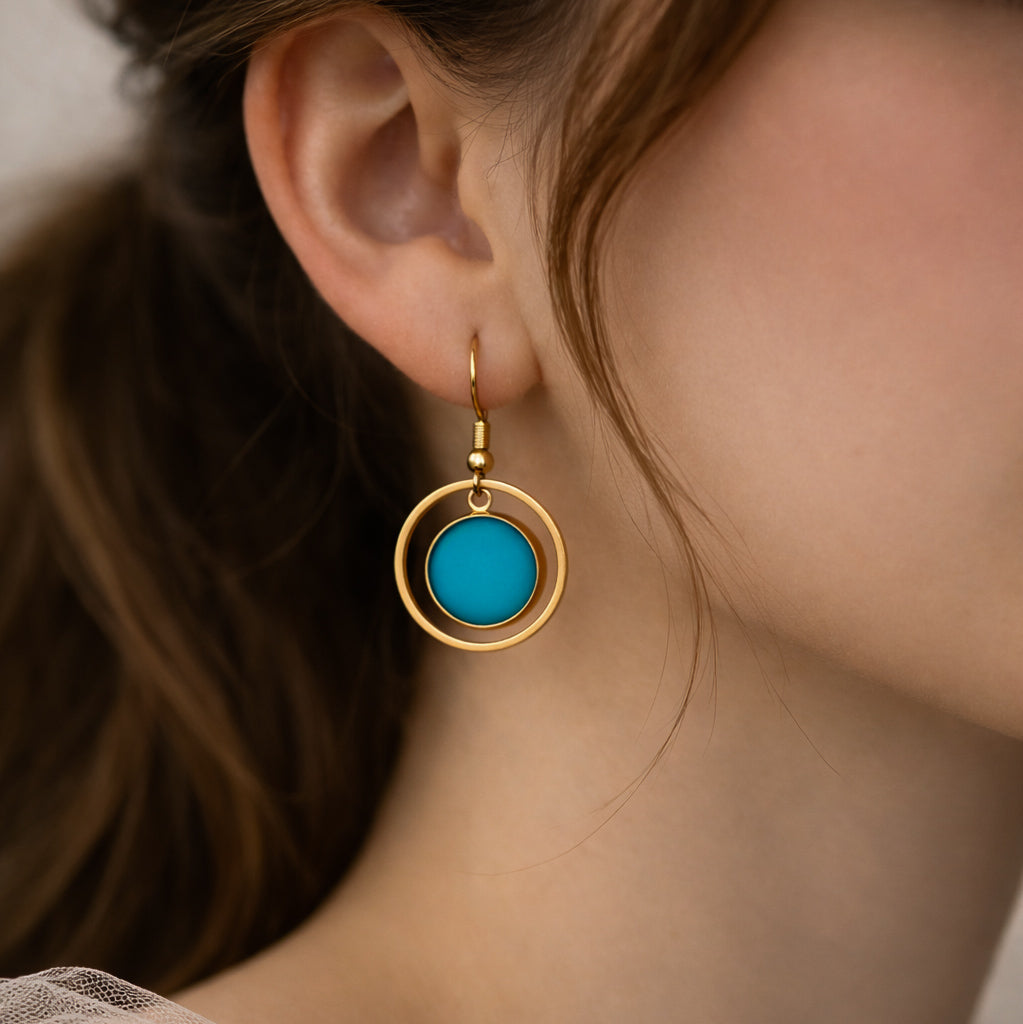 Das matte Türkis wirkt ruhig und modern, ohne aufdringlich zu sein, und ergänzt den warmen Goldton perfekt. Ob zum Kleid, zur Bluse oder zum schlichten Shirt, diese Ohrringe lassen sich vielseitig kombinieren.