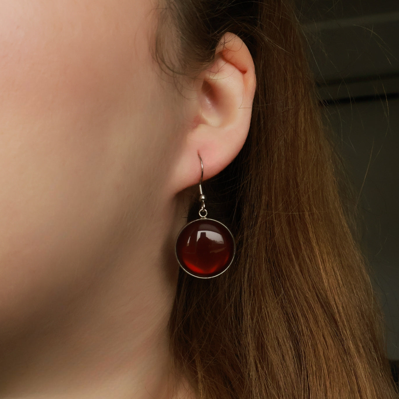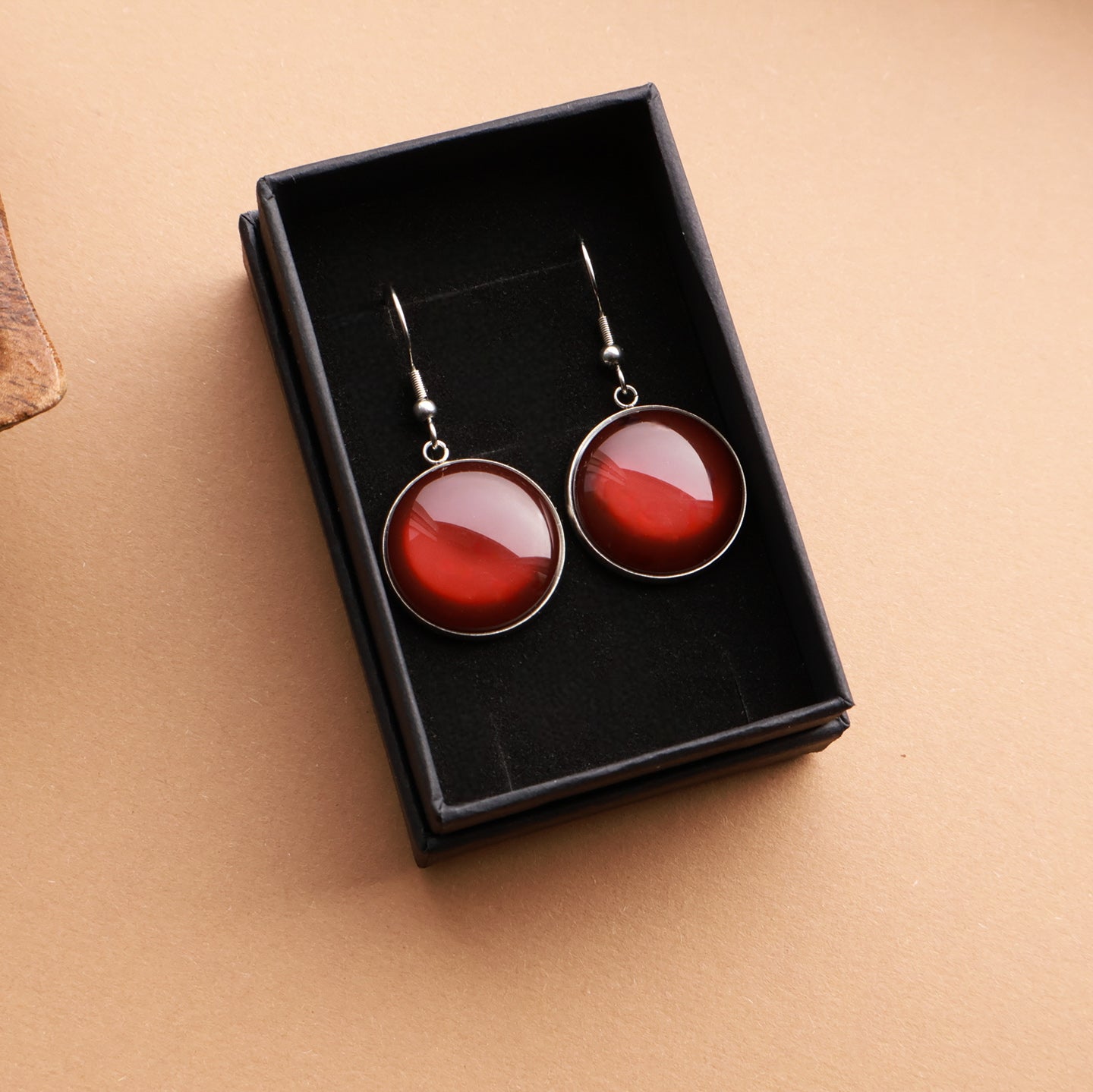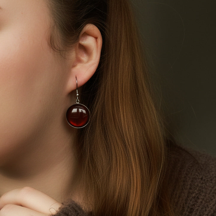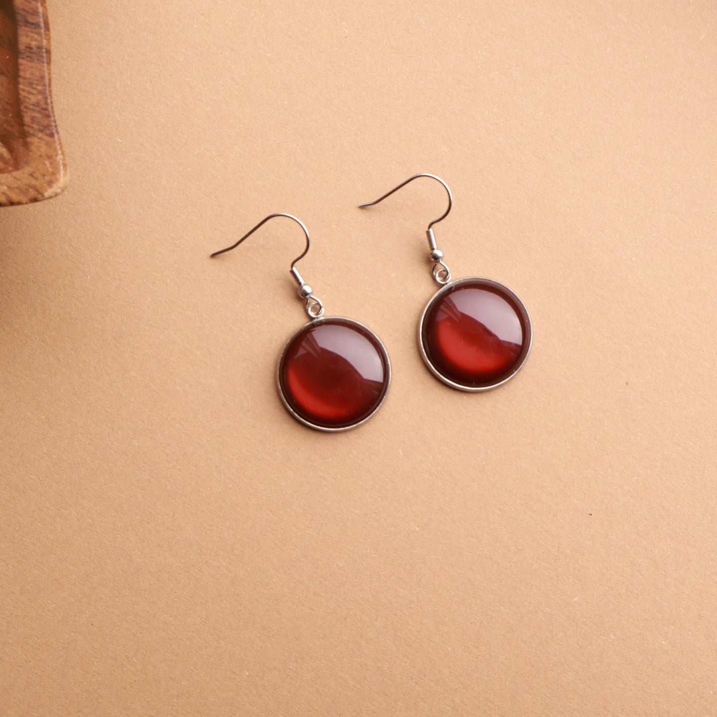 Diese Ohrringe verbinden silbernen Edelstahl mit einem runden, braunen Stein (2 cm), der je nach Lichteinfall einen feinen rötlichen Unterton zeigt.