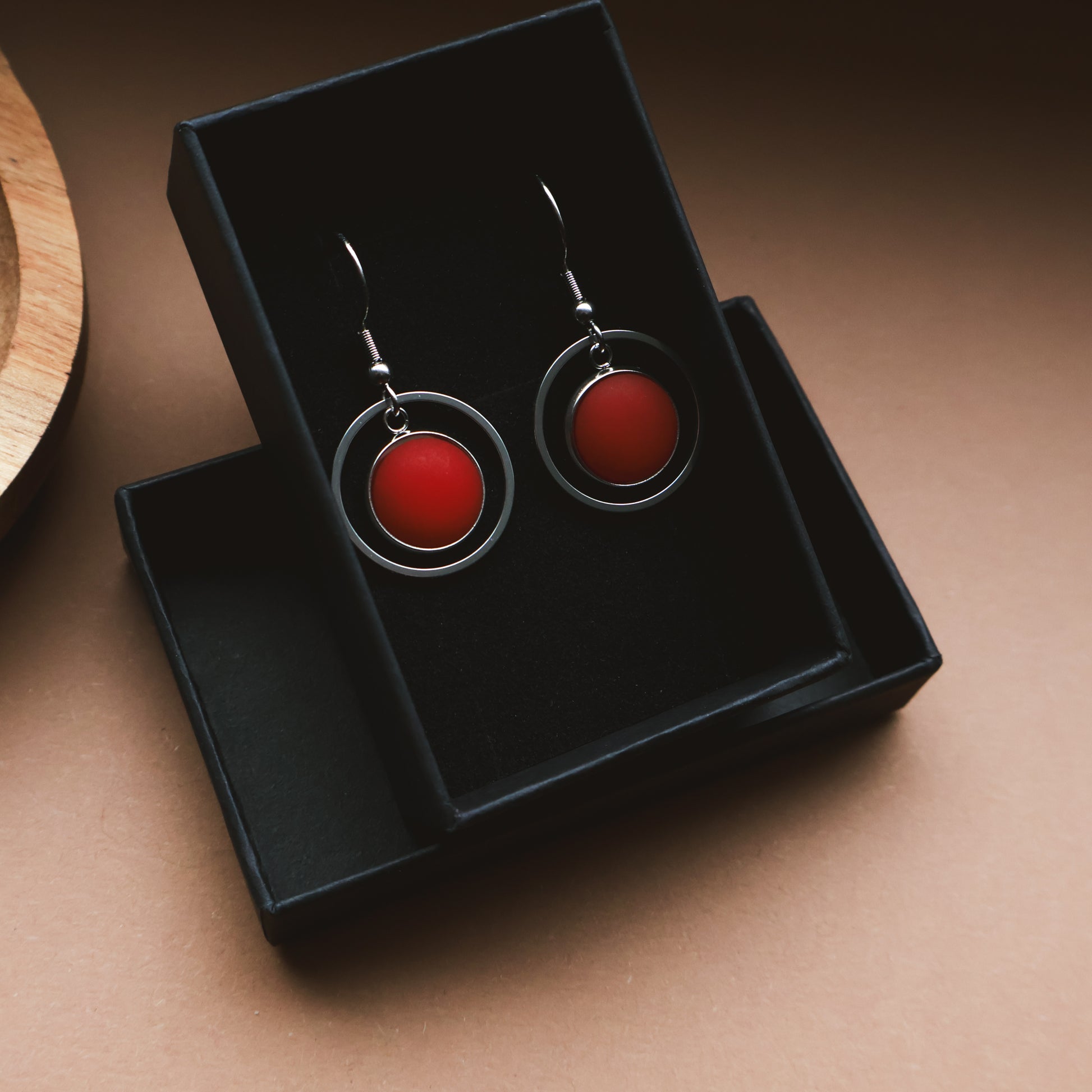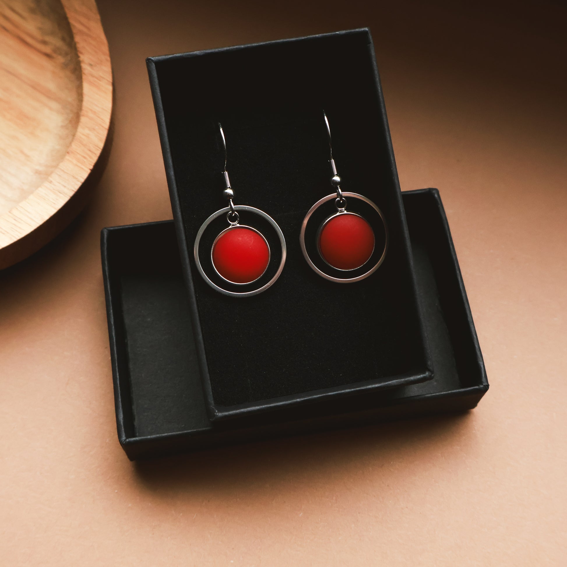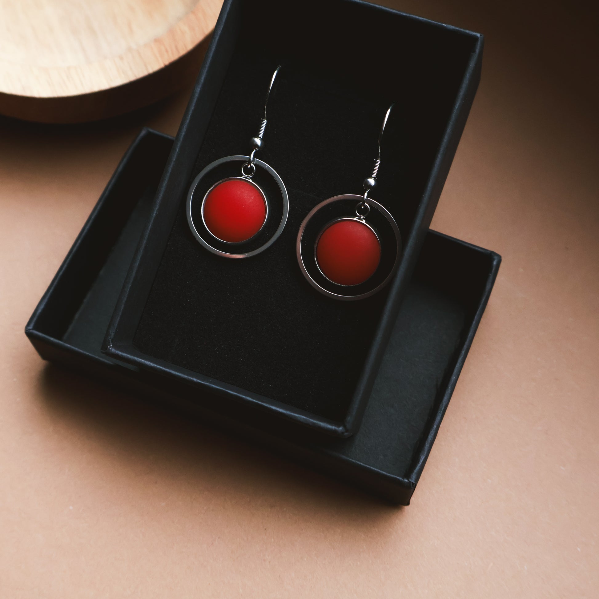 Ohrringe Silber und Rot Matt mit Kreis Anhänger, Edelstahl