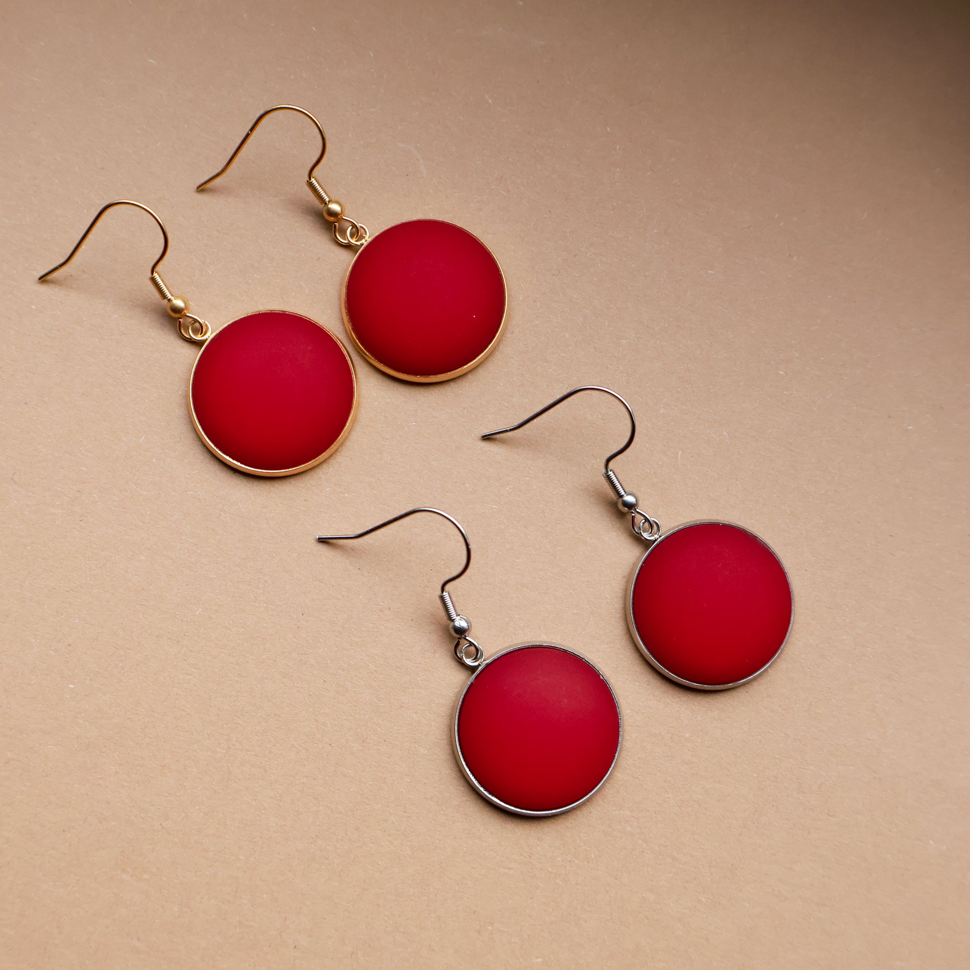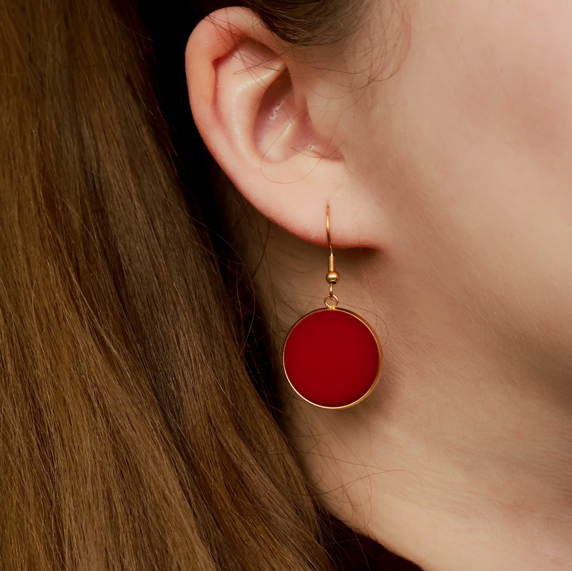 Diese runden Ohrringe in tiefem, matten Rot mit goldfarbener Fassung sind die perfekte Wahl für alle, die klare Formen und kräftige Farben lieben.