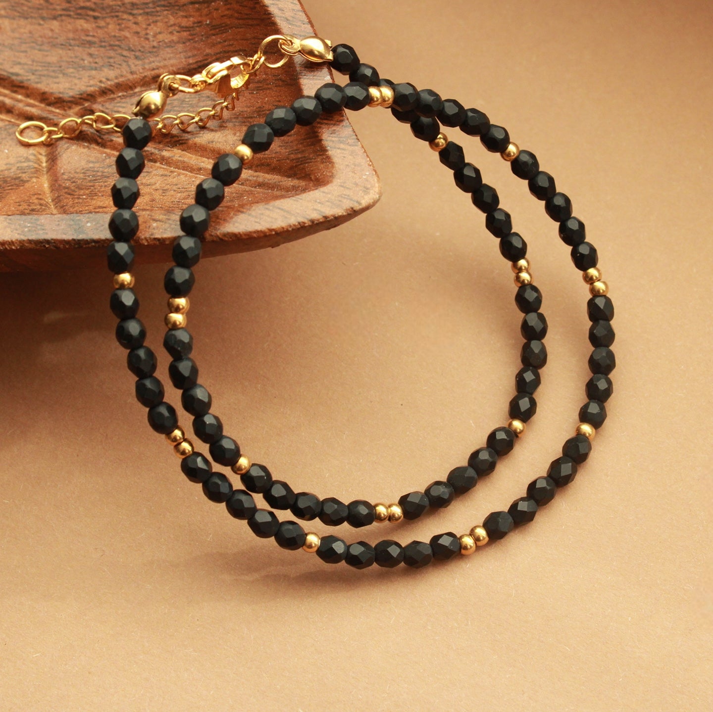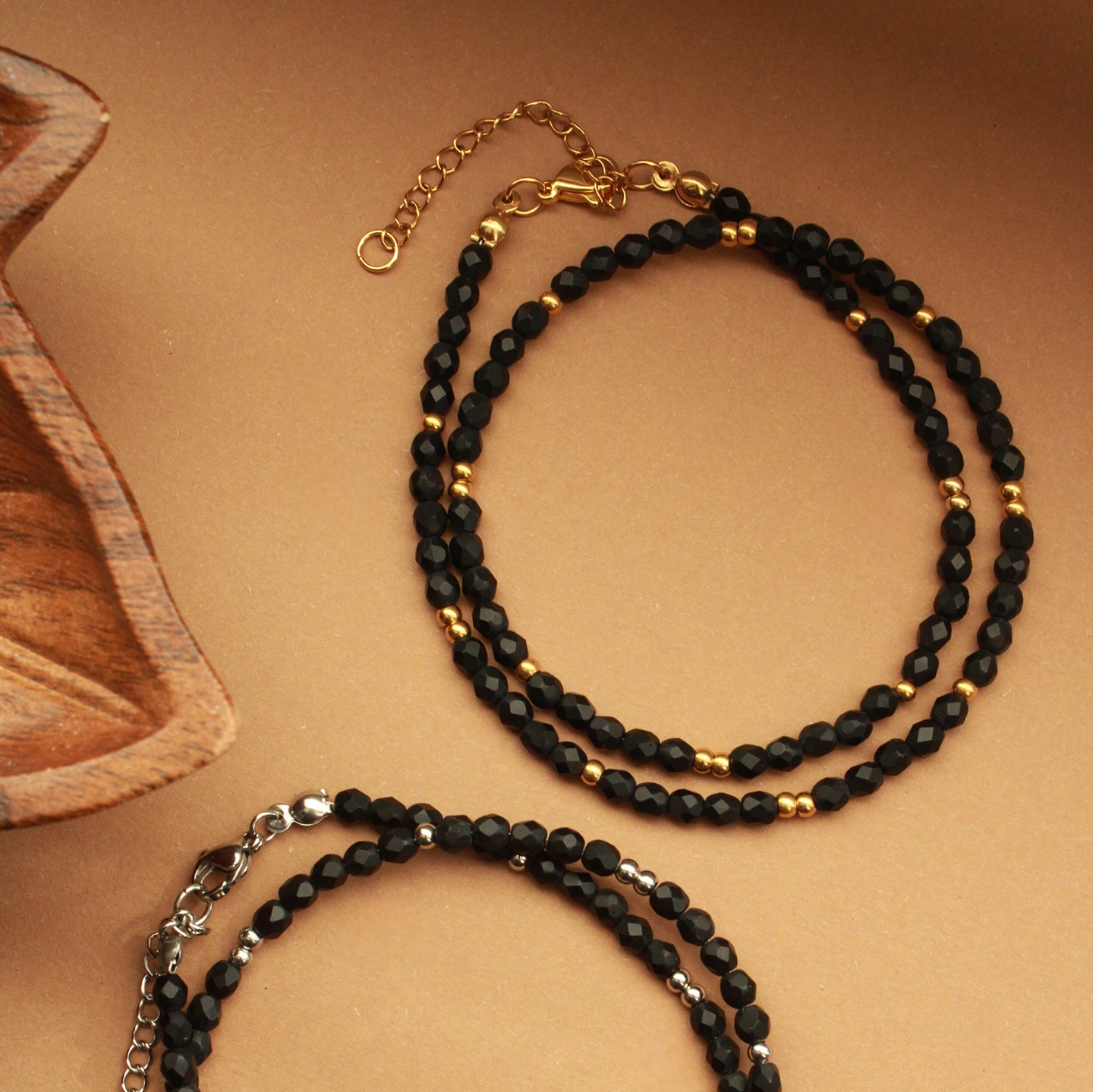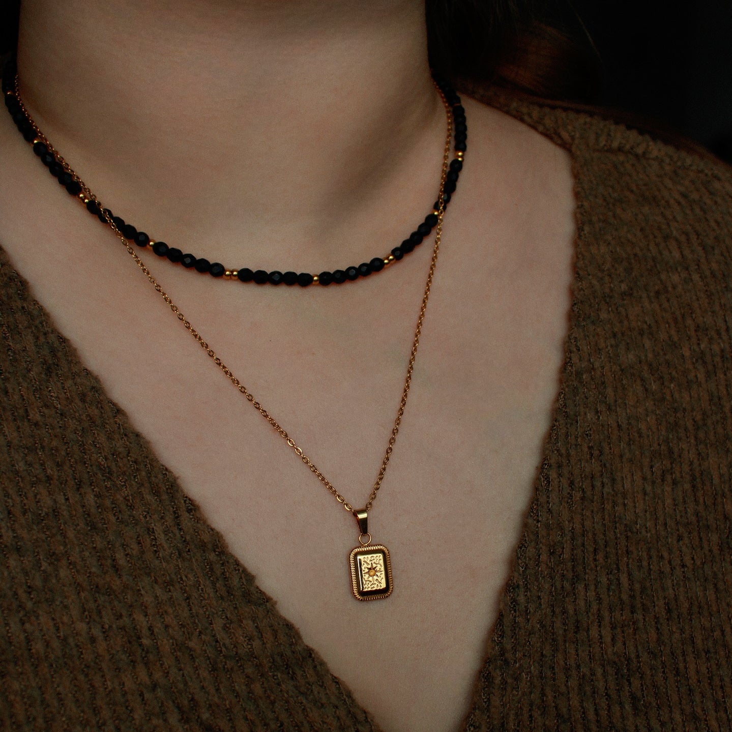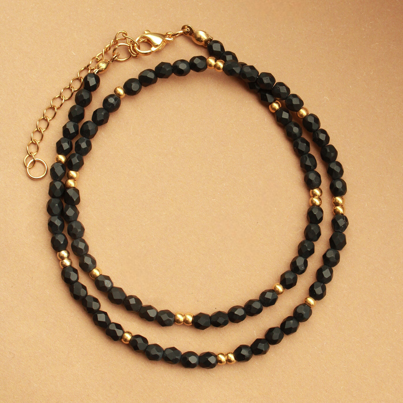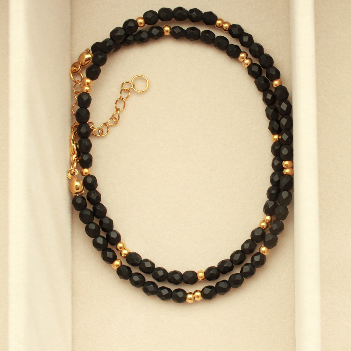Diese Halskette vereint schwarze, matte Glasperlen mit kleinen vergoldeten Edelstahlperlen.
